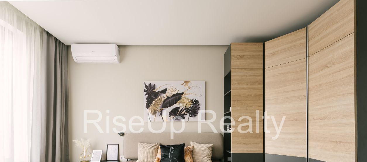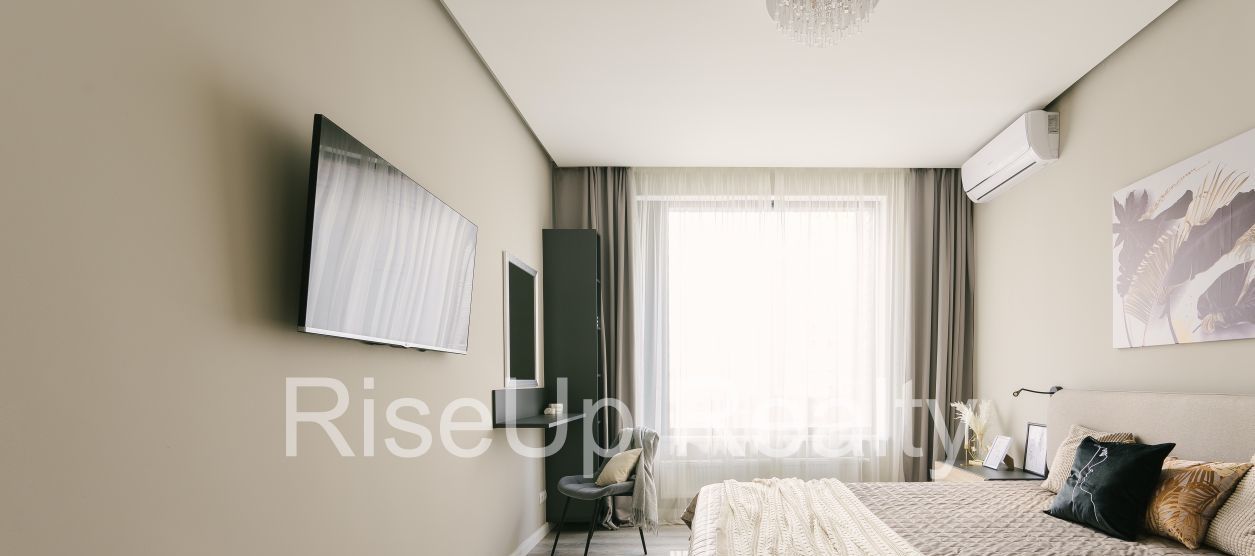 Уютная Спальня с двуспальной кроватью, туалетным столиком с зеркалом, шкаф до потолка, телевизор.