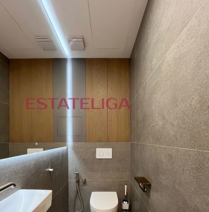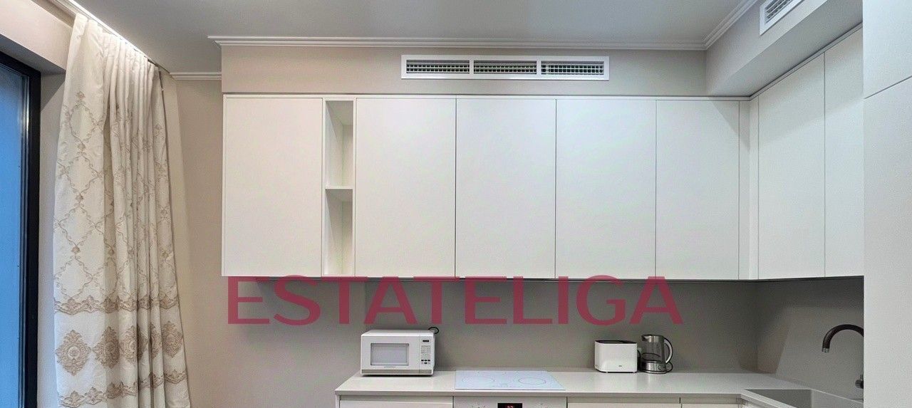 Проведена система кондиционирования фан-койл. Теплые полы в зоне керамогранита, установлена система от протечек. Дизайнерская обстановка, качественная мебель. Вместительный кухонный гарнитур, много мест для хранения в прихожей и спальне.