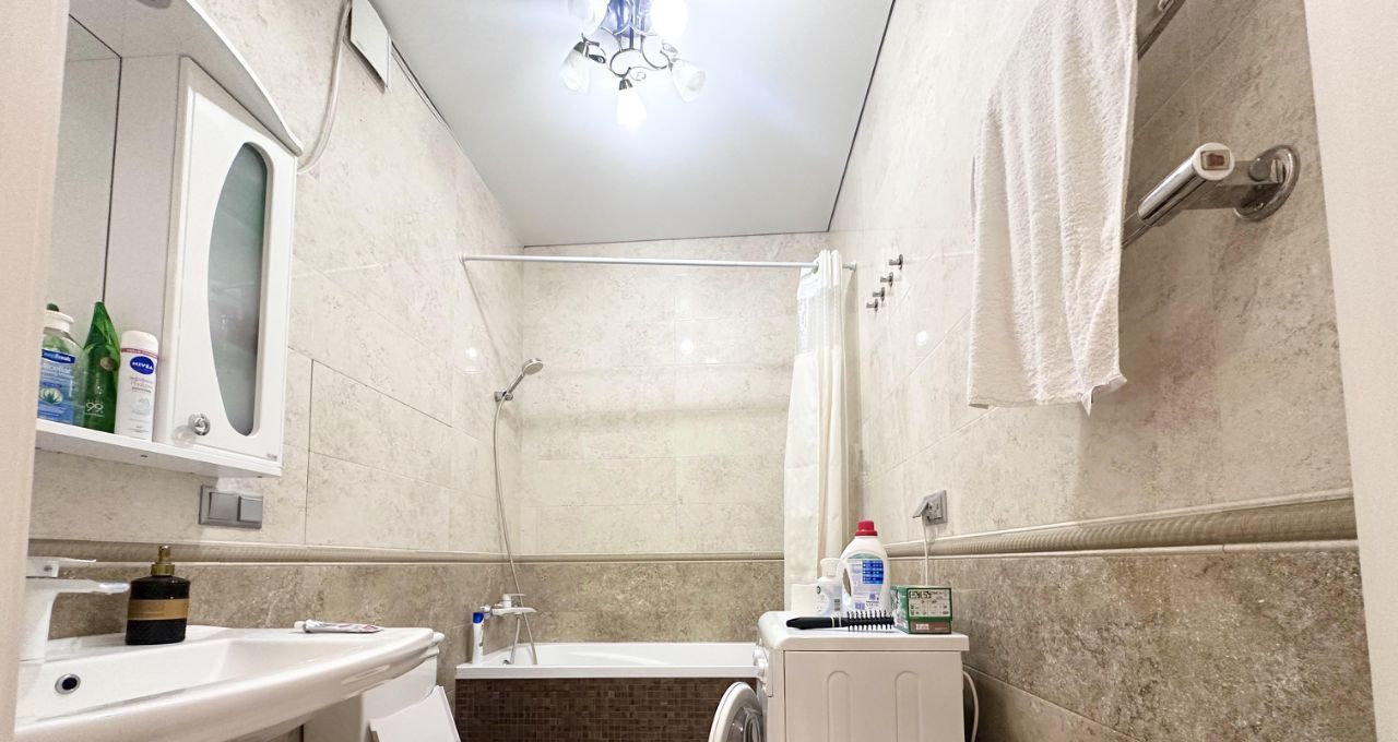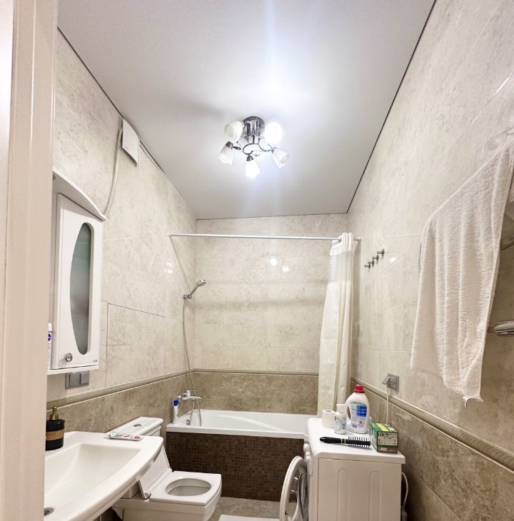 В квартире сделан качественный евроремонт. На кухне и в комнате есть вся необходимая мебель. Для вашего комфорта установлены кондиционер, холодильник, посудомоечная машина, телевизор и стиральная машина. Санузел совмещённый, оборудован ванной. Есть лоджия для приятного отдыха или хранения нужных вещей.
