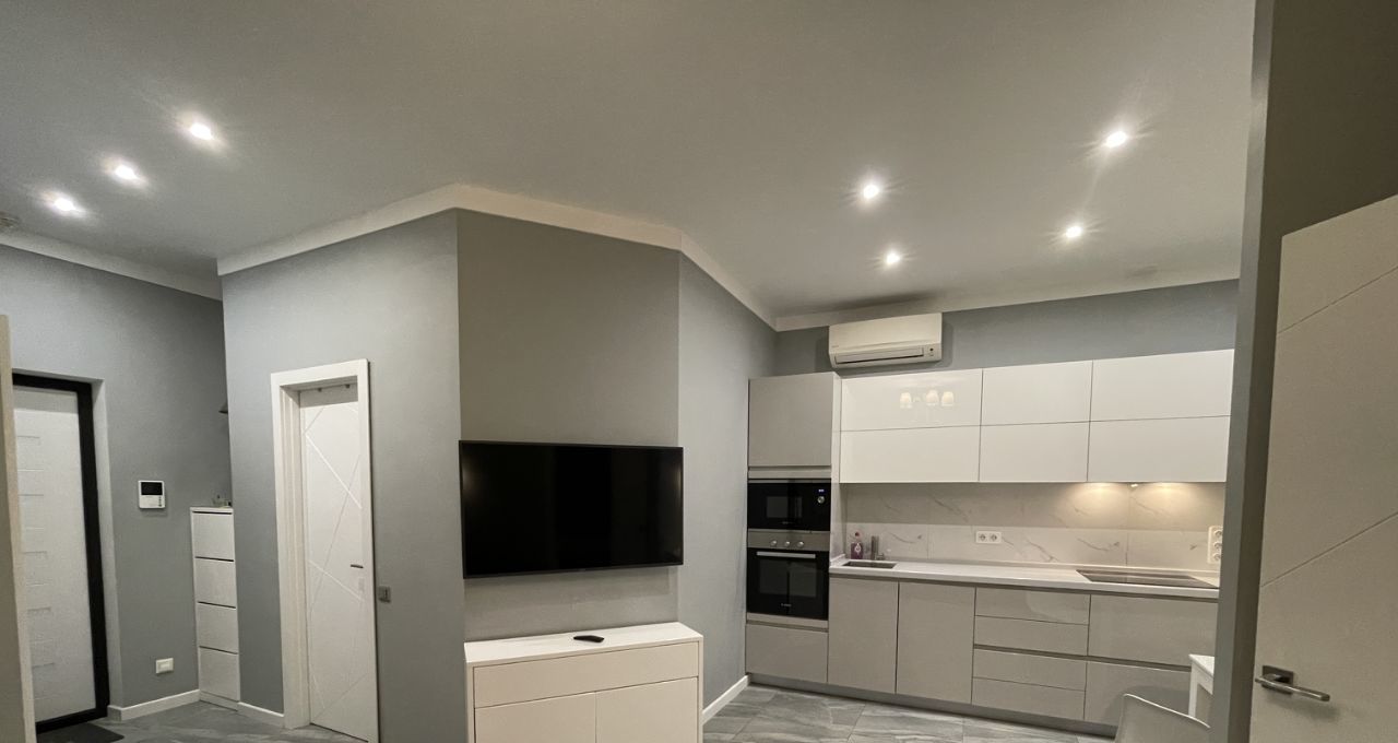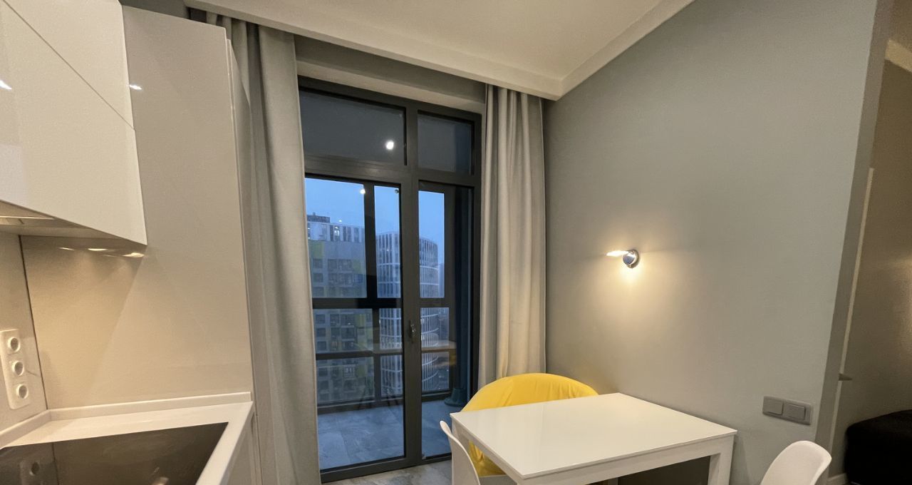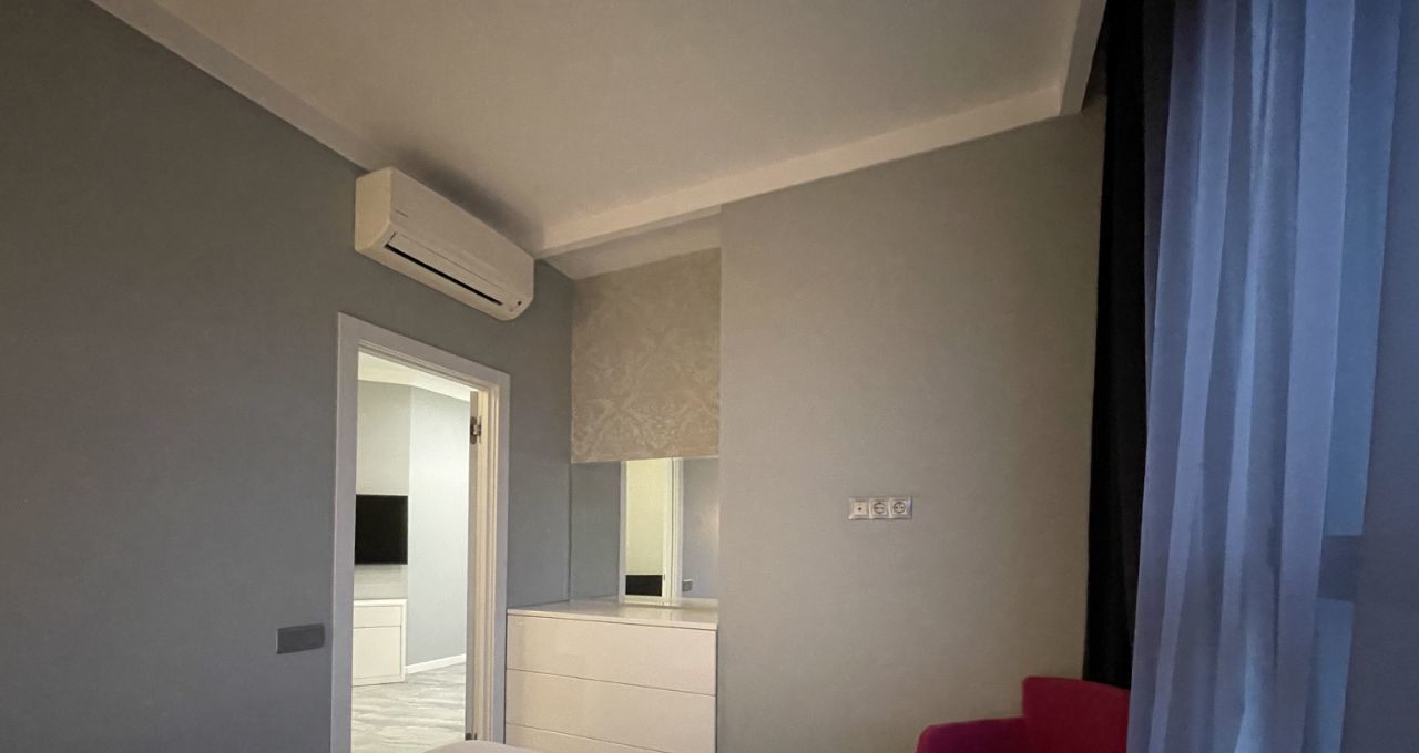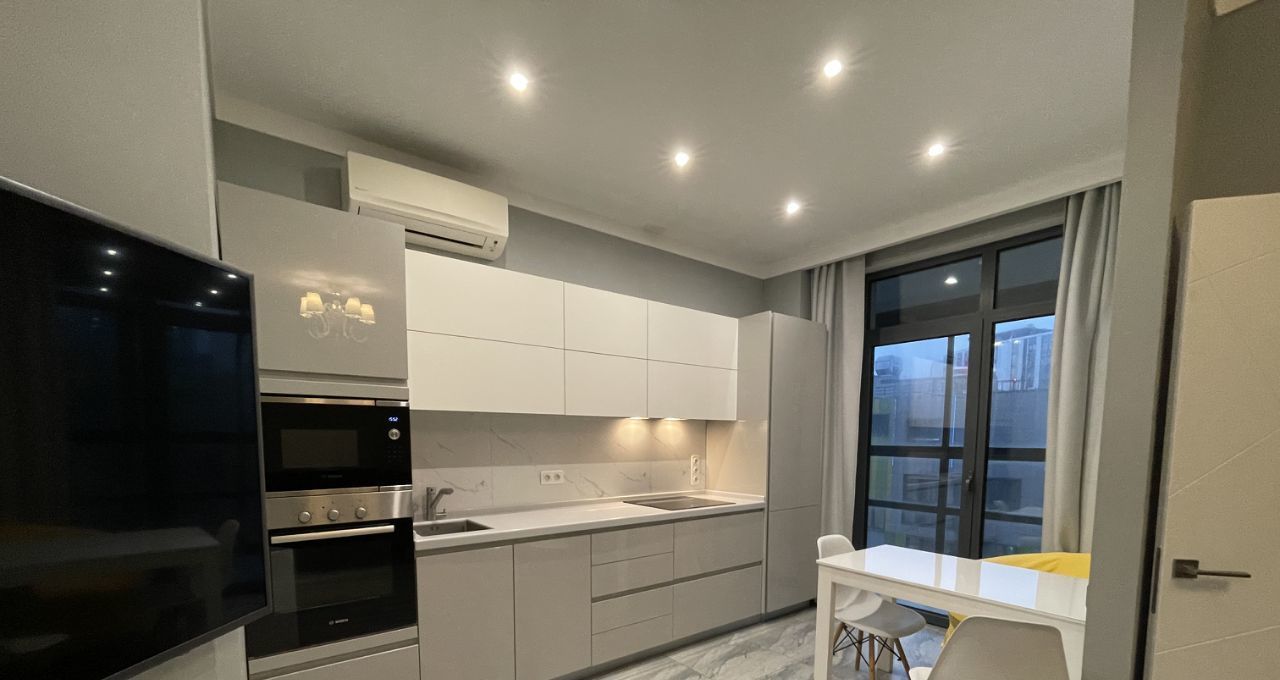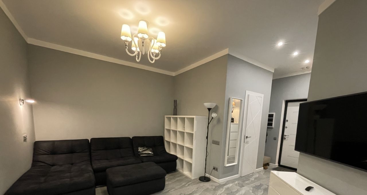 Двухкомнатная квартира - кухня объединенная с гостиной, спальня, гардеробная комната, большая ванная комната. Квартира проектировалась для себя, всё до мелочей для удобства продумано: много розеток, проходные выключатели, большая функциональная кухня: вся техника BOSCH, ПММ с подсветкой, крайне удобный диван с большим ЖК телевизором, гардеробная продумана до мм, в ней находится встроенная гладильная доска, которая раскладывается за 2 сек (очень удобно для быстрой глажки), в ванной тропический душ, бойлер, полы везде с подогревом, два кондиционера, большая застеклённая лоджия. Никаких доп вложений не требует. Окна в тихий двор без машин. Животные не приветствуются, но обсуждаются. Так же можно за доп плату снять машиноместо в этом же комплексе.