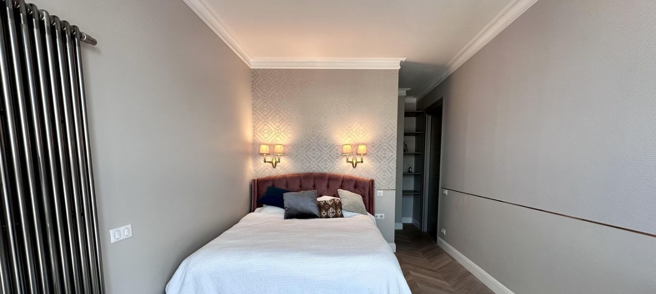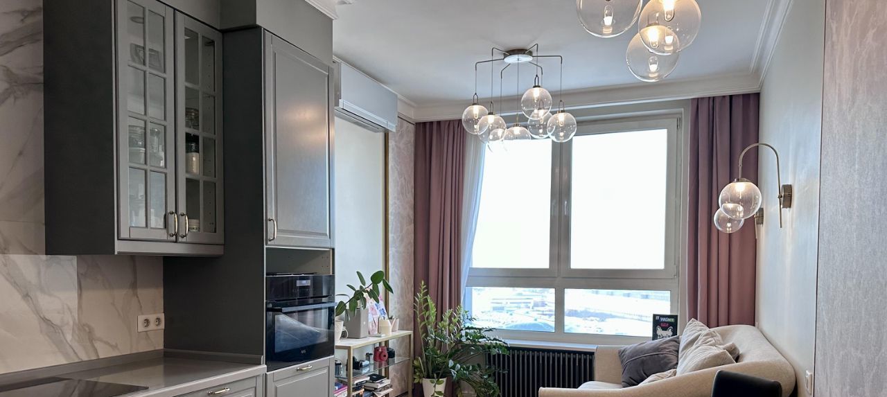 Выполнен качественный дизайнерский ремонт с использованием премиальных материалов. Интерьер продуман до мелочей: ничего лишнего, только комфорт, эстетика и функциональность. Отдельная спальня с полноценной зоной хранения располагает к уединению и спокойствию.