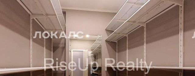 Гардеробная комната оборудована системами хранения для удобного пользования.