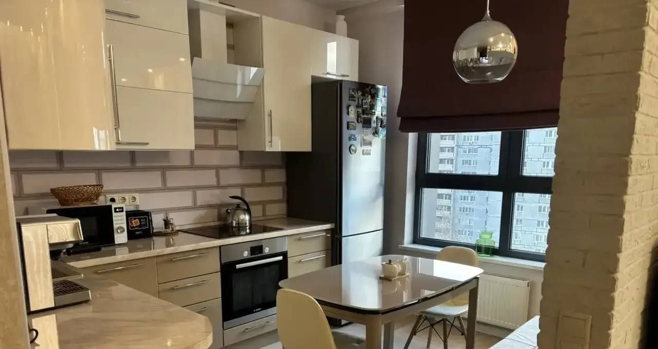В квартире установлен кухонный гарнитур со встроенной бытовой техникой, холодильник.
