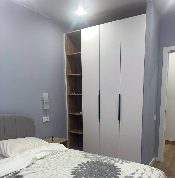 В комнатах и на кухне — удобная мебель (раскладкой стол на кухне, кровать с подъемным механизмом в спальне, диван с возможностью выбрать угол или оставить прямым.