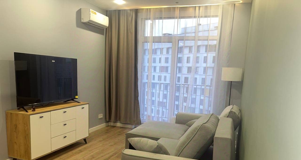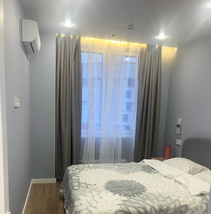 Квартира оформлена в спокойных светлых тонах и оснащена всей необходимой техникой: кондиционеры (в гостиной и спальне), холодильник, телевизор, посудомоечная и стиральная машины, варочная поверхность, духовой шкаф.