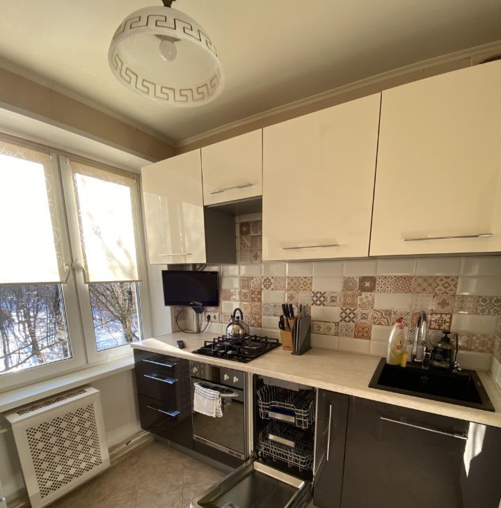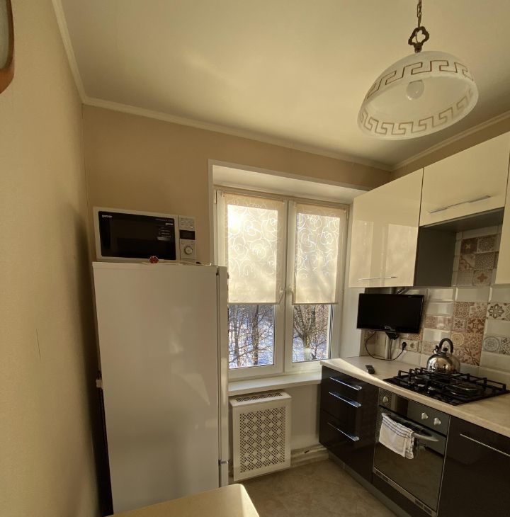 На кухне есть вся необходимая техника: холодильник, духовка, варочная панель, микроволновка, посудомоечная машина, телевизор.