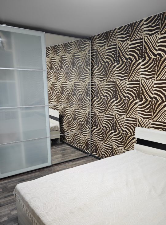 На кухне установлен современный гарнитур, индукционная плита и духовка от Samsung, также есть стиральная машина. В спальне - огромный шкаф-купе и кровать с прекрасным матрасом.