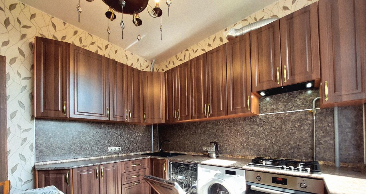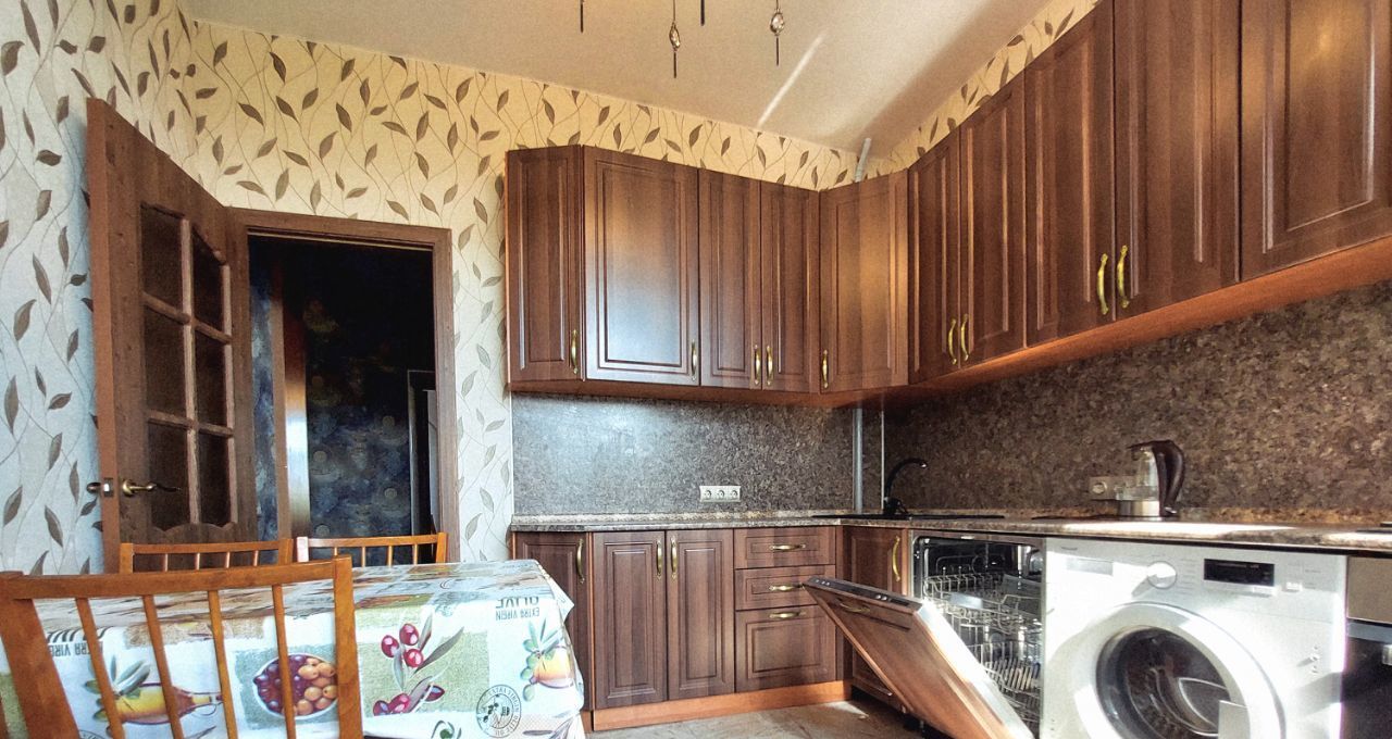 В кухне - гарнитур, стиральная машина, плита с духовкой, вытяжка, 2х камерный холодильник, обеденный стол, стулья.