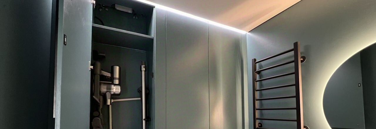 Ванная комната выполнена по индивидуальному дизайну с продуманной дополнительной системой хранения и стиральной машиной.