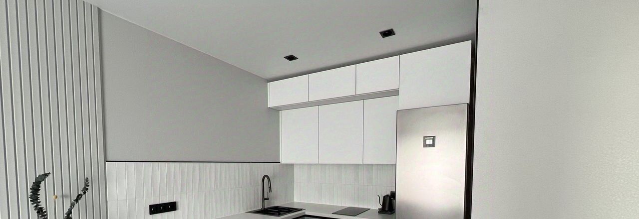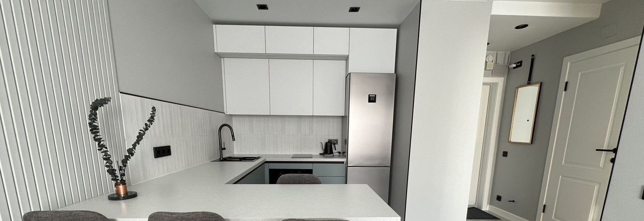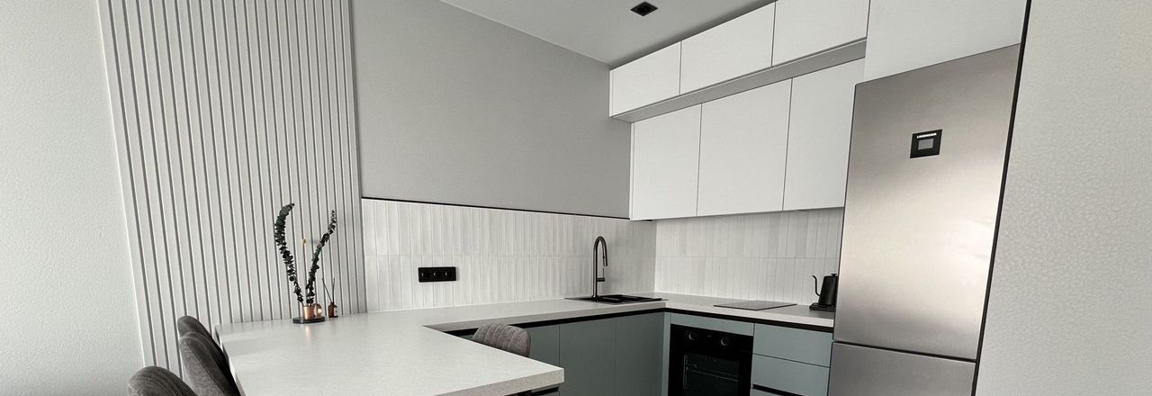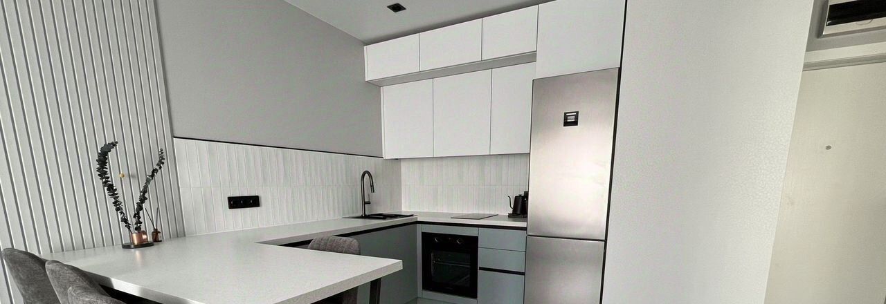 Кухня оснащена духовым шкафом, варочной панелью, холодильник и посудомоечная машина, микроволновка