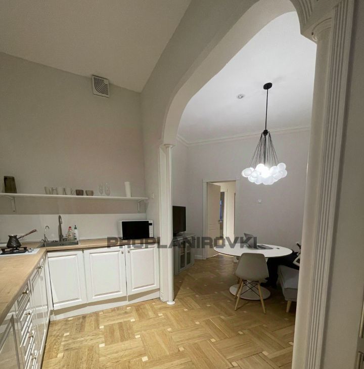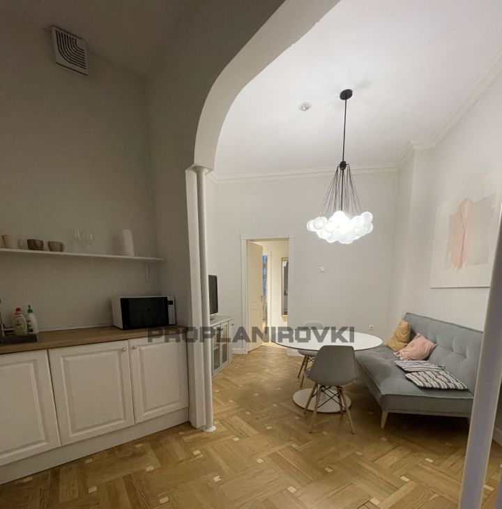 Для вас: функциональная кухня с гарнитуром и бытовой техникой (холодильник, плита, микроволновка, кофемашина, электрический чайник), комфортный диван, кухонный стол, телевизор.