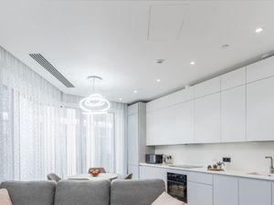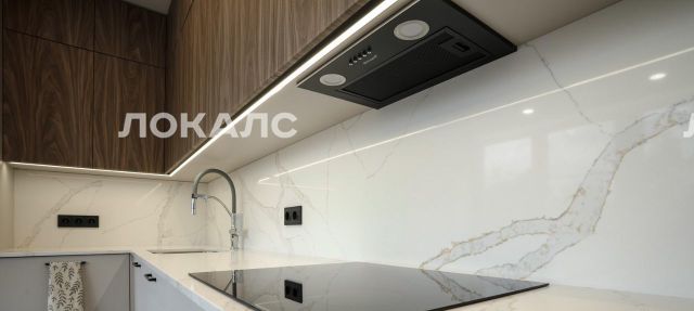 Встроенная кухня с новой техникой — варочная панель, духовой шкаф, посудомоечная машина, холодильник, стиральная машина, кондиционер.