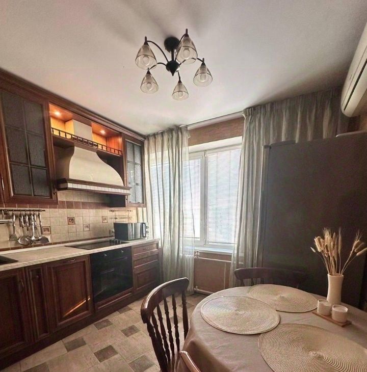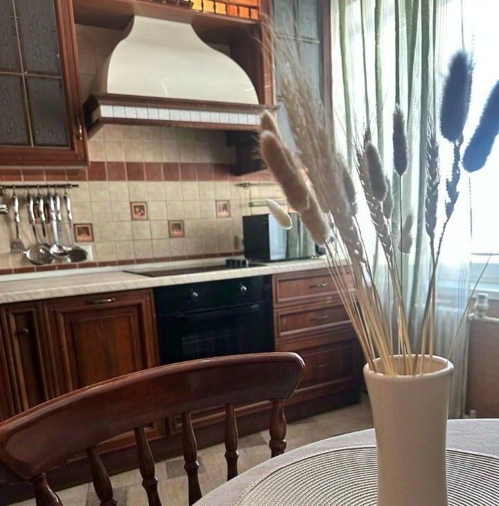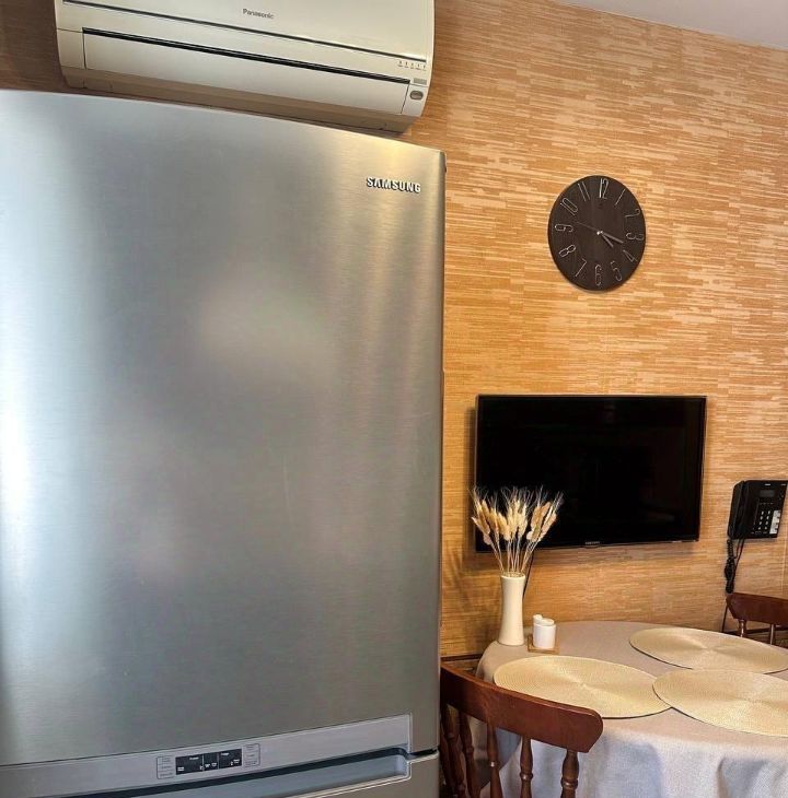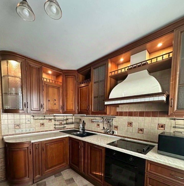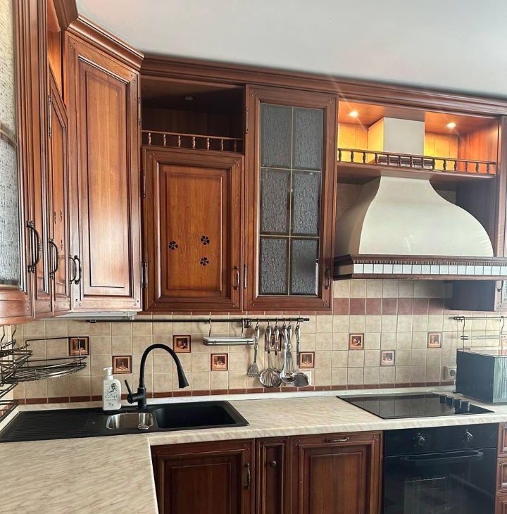 итальянский гарнитур из массива, духовка, варочная панель, вытяжка, холодильник Samsung, посудомоечная и стиральная машины, микроволновка, телевизор. Есть вся необходимая посуда. Обеденная зона на 3 человека.
