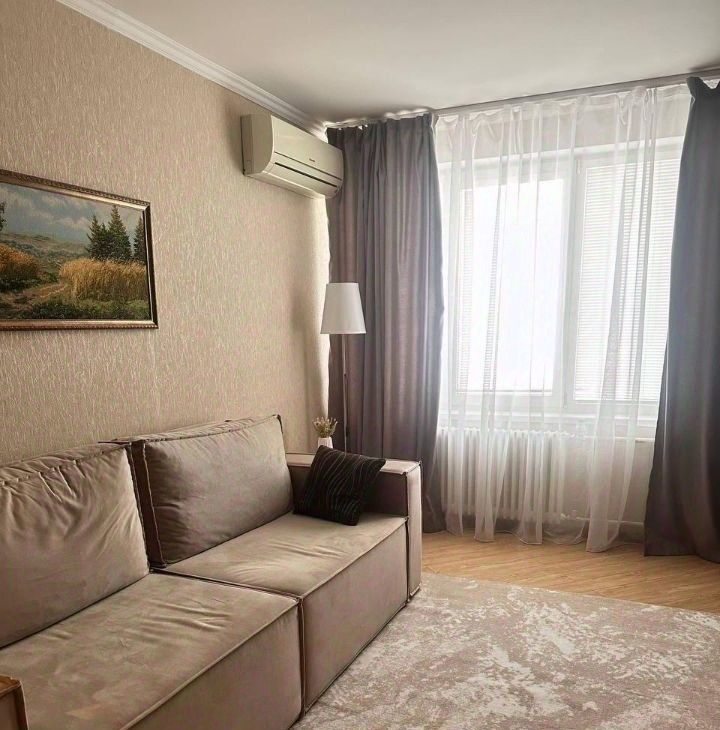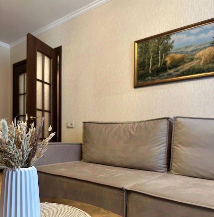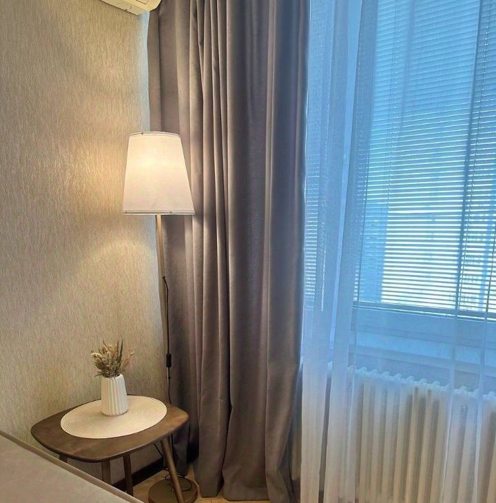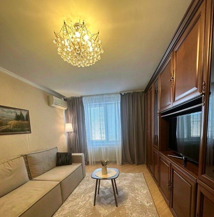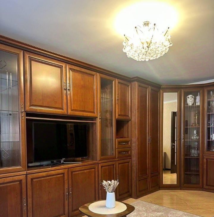 Просторная и уютная: итальянская мебель из массива, диван, телевизор, журнальный столик, торшер, ковёр, шторы Blackout, люстра.