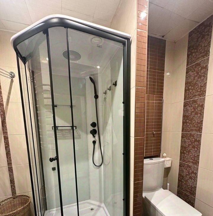 Совмещённый: душевая кабина, раковина с тумбой, унитаз.