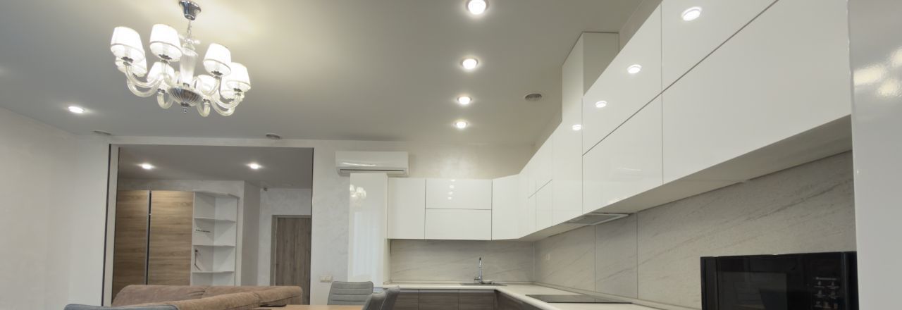 Кухонный гарнитур под единой столешницей, со встроенной техникой, обеденной группой.