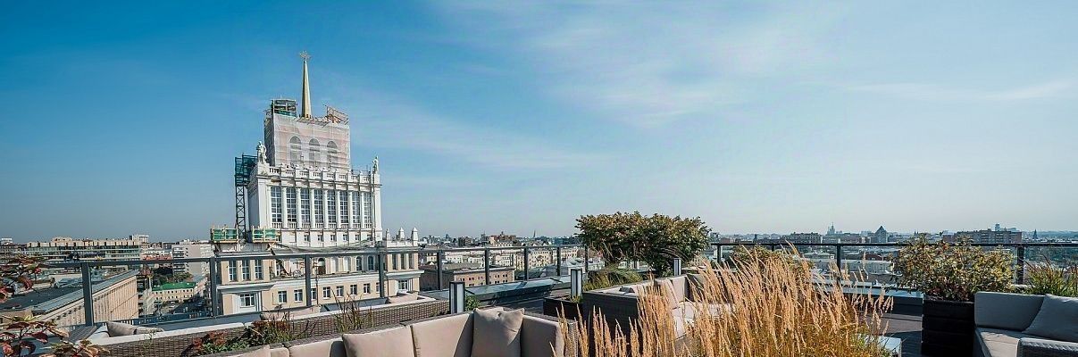 На крыше — зона отдыха с садами.
