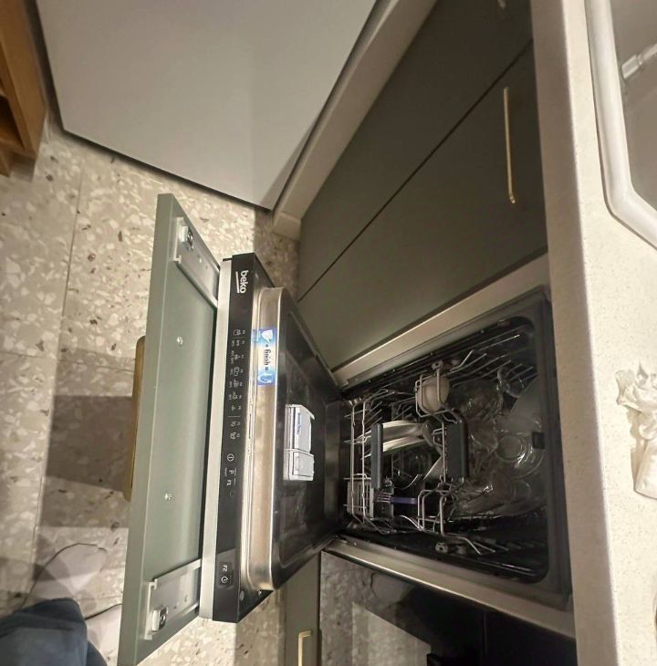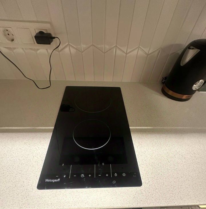 индукционная плита, посудомоечная машина, холодильник с морозильной камерой, микроволновка, кофемашина, чайник, полный комплект посуды.