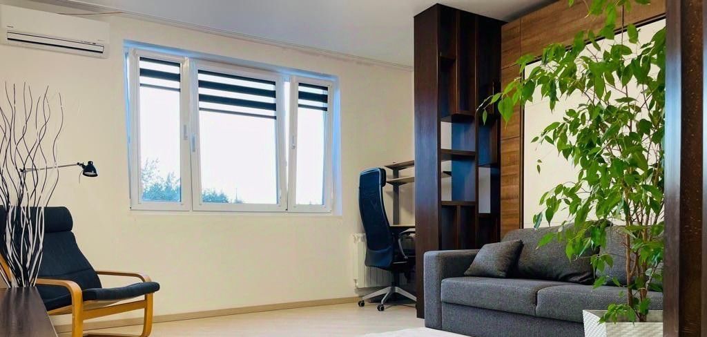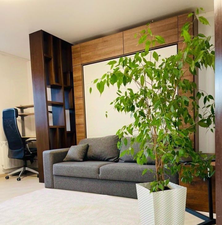 Гостиная-кабинет: удобная рабочая зона, удобный диван и в ночное время с дивана можно снять подушки и разложить полноценную кровать с ортопедическим матрасом.