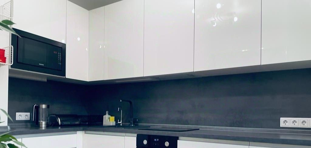 Кухня: микроволновка, варочная панель, духовка, холодильник и морозильник (встроенные под столешницей)