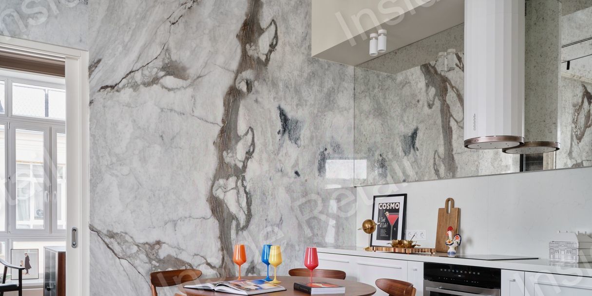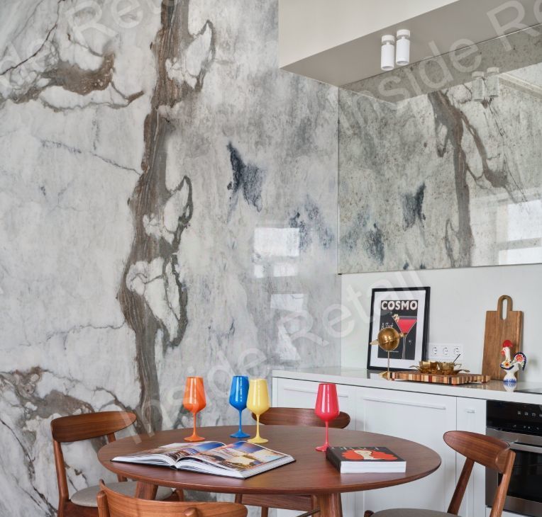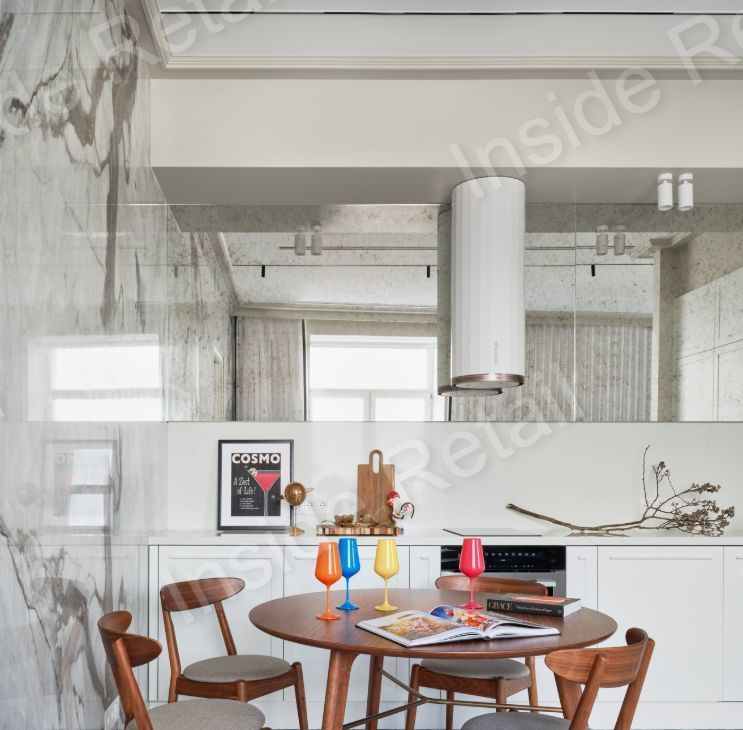 Зеркальное оформление из состаренного зеркала кухонной стены расширяет границы пространства и создает дополнительную глубину.