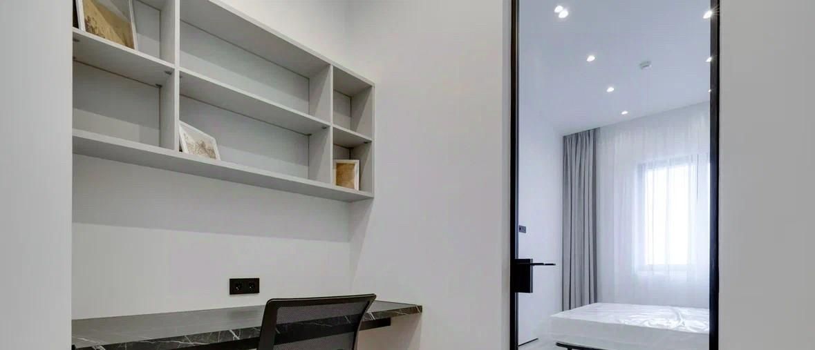Квартира с 1 спальней, кабинетом, просторной гостиной и кухней, просторной отдельной гардеробной и санузлом. Квартира оснащена техникой Bosch, стиральной и сушильной машинами gorenje, кофеваркой nespresso, телевизор Samsung. Вся мебель произведена мебельной фабрикой премиум класса. Огороженная территория с охраной, зоной ресепшен, с наземной и подземной парковкой.