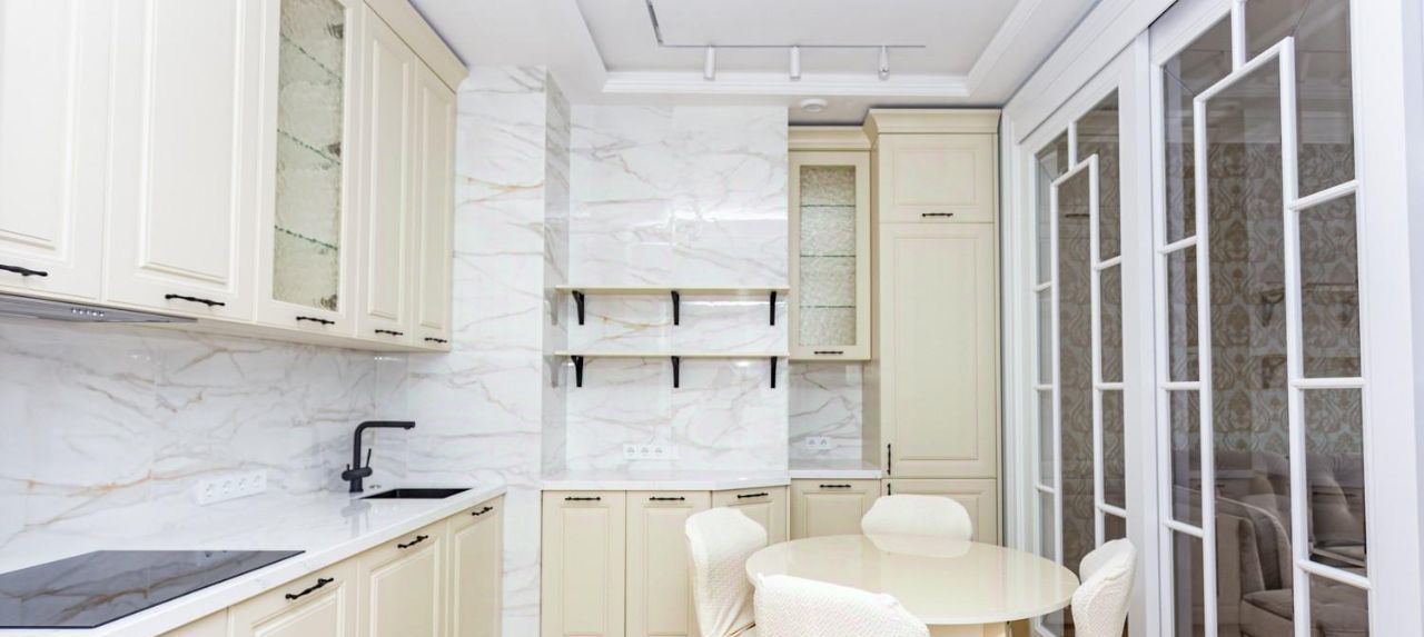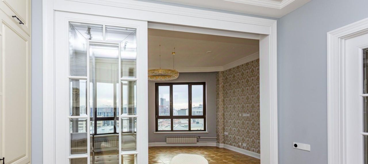 Кухня-гостиная 35+ м² — сердце апартаментов. Раздвижные двери позволяют изолировать кухню при приёме гостей.