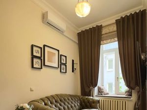 Комнаты раздельные. Потолки 3 метра. Гостиная- 23м - светлая,3 окна, шкаф, диван раскладной, ЖК телевизор, кондиционер.