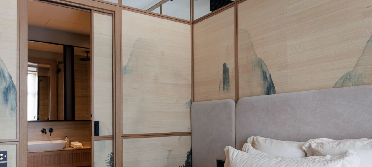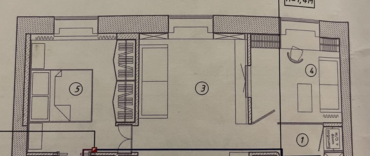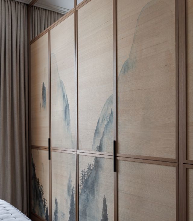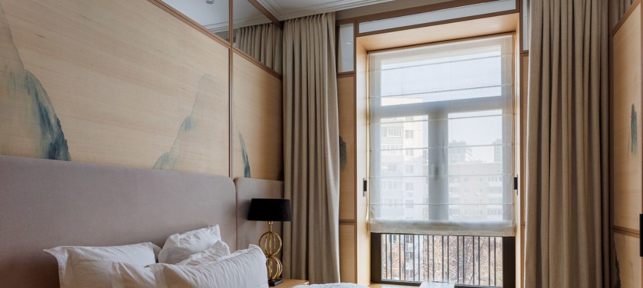 Мастер- спальня со своей ванной комнатой и душевой из натурального камня. Необычные обои по всему пространству комнаты, встроенные шкафы. Вся мебель изготовлена под заказ. Темные портьеры открываются и закрываются с пульта.