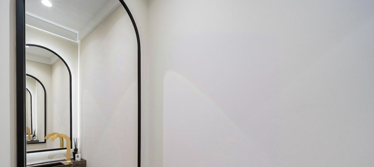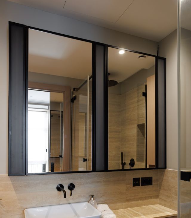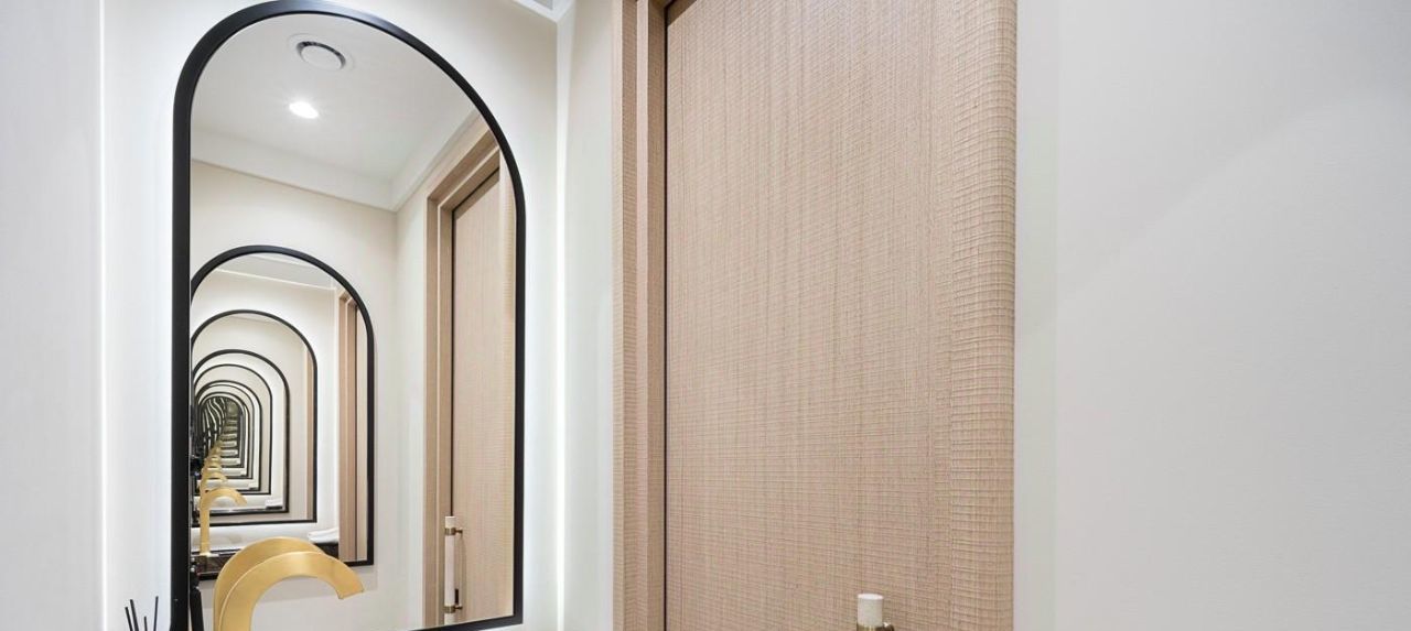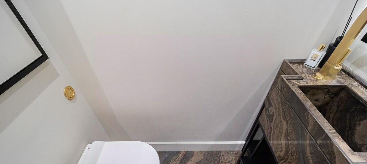 Второй (гостевой с/у) с раковиной из камня и зеркалами. Встроенный шкаф для мелочей.