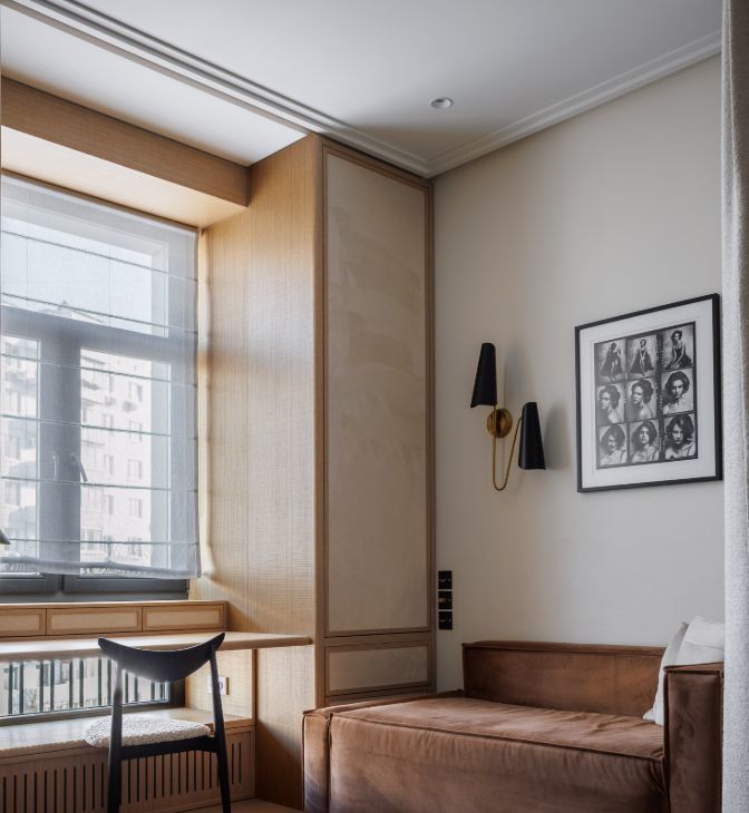 Вторая комната с камином , которая может быть использован в качестве кабинета, детской или гостевой. Плавающая дверь может отделять или увеличивать пространство комнаты. Огромные шкафы в полоток, встроенный рабочий стол, светильники все очень стильно и гармонично. Диван раскладывается в спальное место.