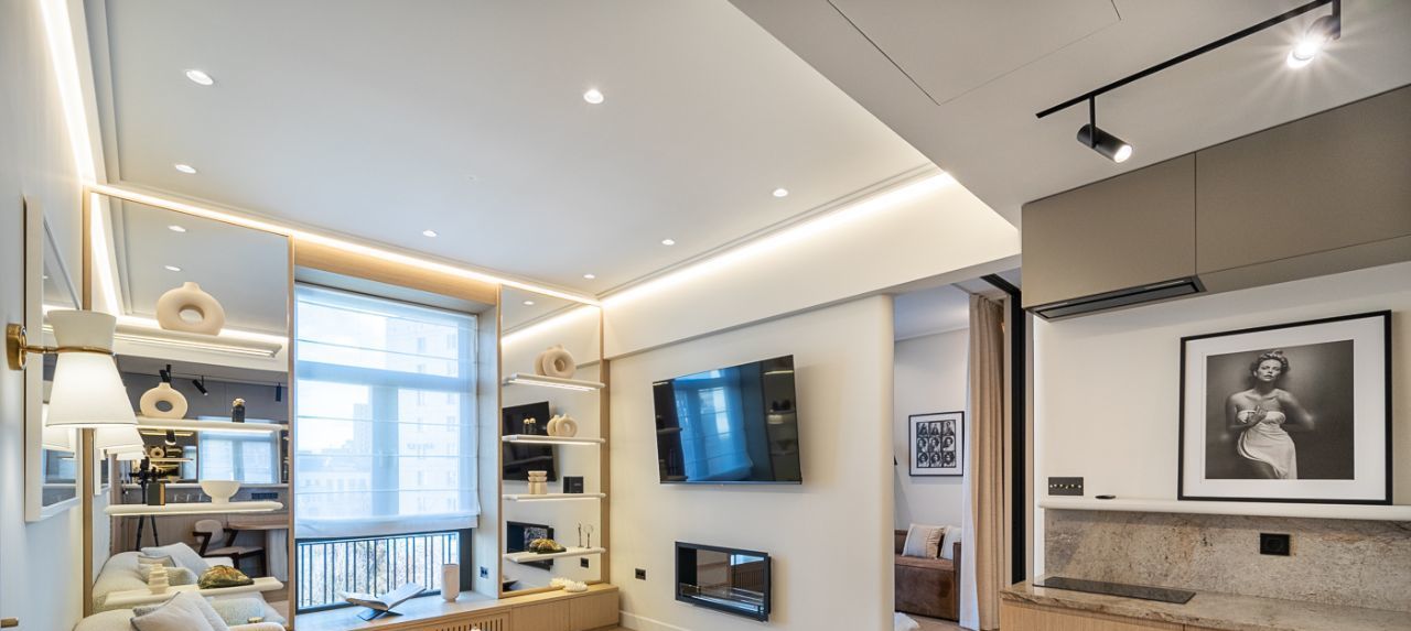 Кухня-гостиная с камином, много разной подсветки, что делает апартаменты в любое время суток очень красивыми и уютными. Премиальная бытовая техника. Встроенная мебель изготовленная под заказ. Красивый и удобный диван.