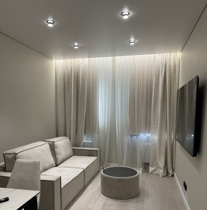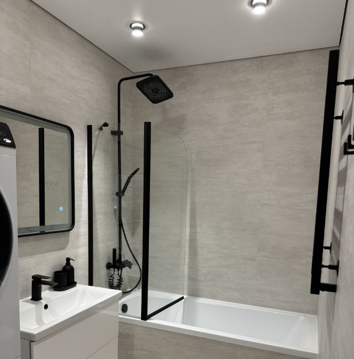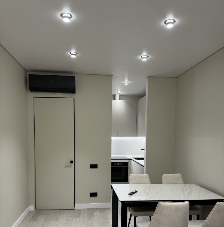 В квартире сделан дизайнерский ремонт, благодаря которому создаётся уютная и современная атмосфера. В комнате и на кухне есть вся необходимая мебель. Для вашего комфорта установлены кондиционер, холодильник, телевизор, а также посудомоечная и стиральная машины. Санузел совмещенный, в нём есть и ванна, и душевая кабина, что делает его удобным для использования в любое время суток.