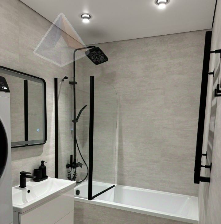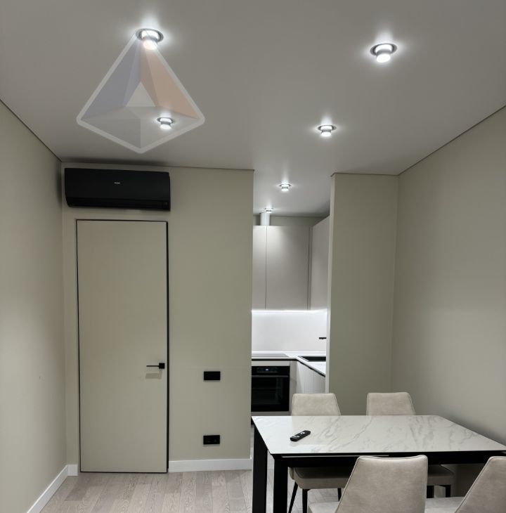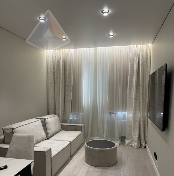 50 м² дизайнерского интерьера. Здесь нет случайных вещей — только продуманная эргономика и эстетика. Готовая мебель, техника премиум-класса и санузел, сочетающий ванну и душевую кабину, создают уровень комфорта отеля высокого класса.