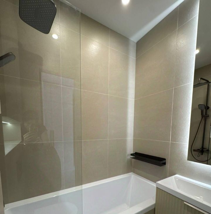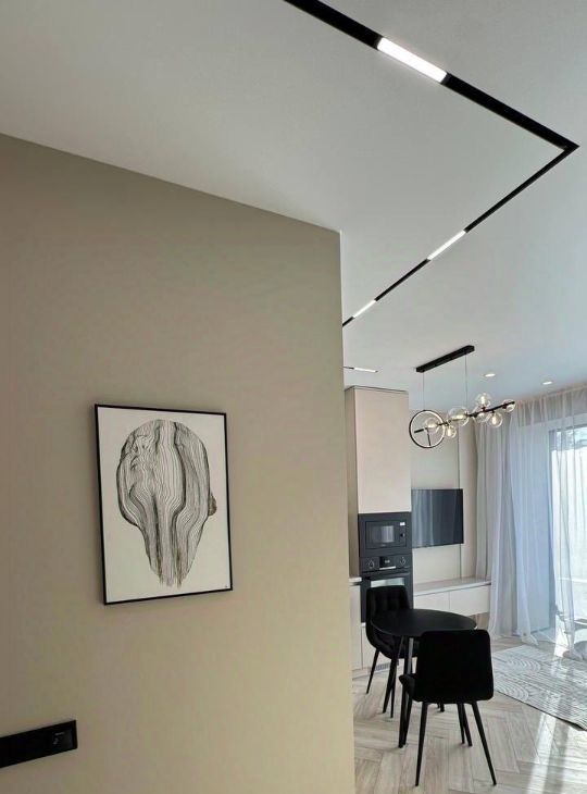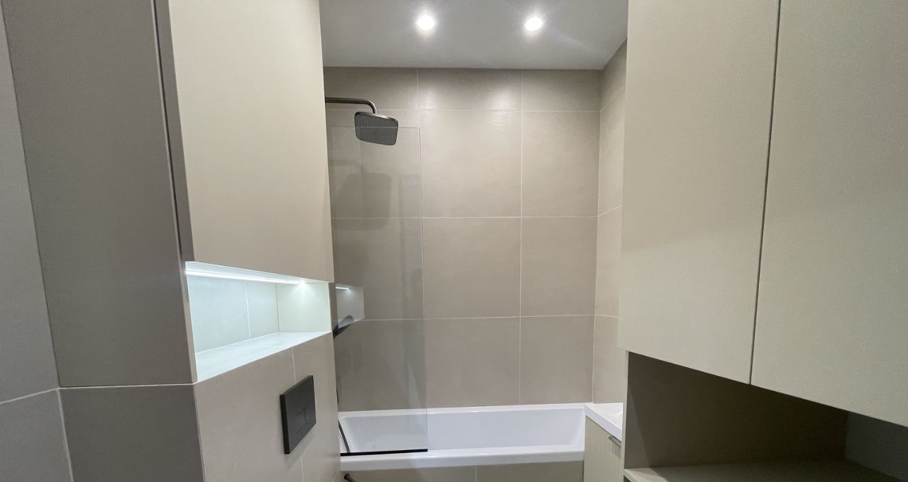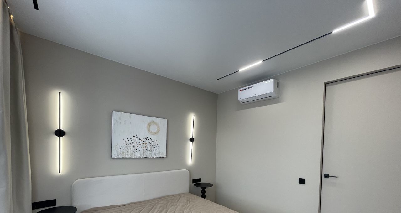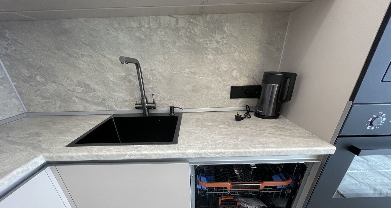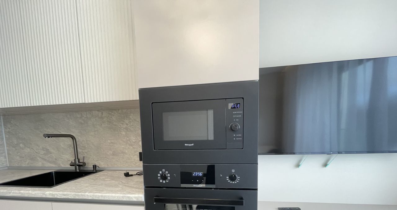 Установлена вся необходимая бытовая техника: посудомоечная машина, СВЧ-печь, духовой шкаф, встроенный холодильник, стиральная машина, 2 Кондиционера, 2 Телевизора, теплый пол в сан/узле, есть пылесос, утюг,