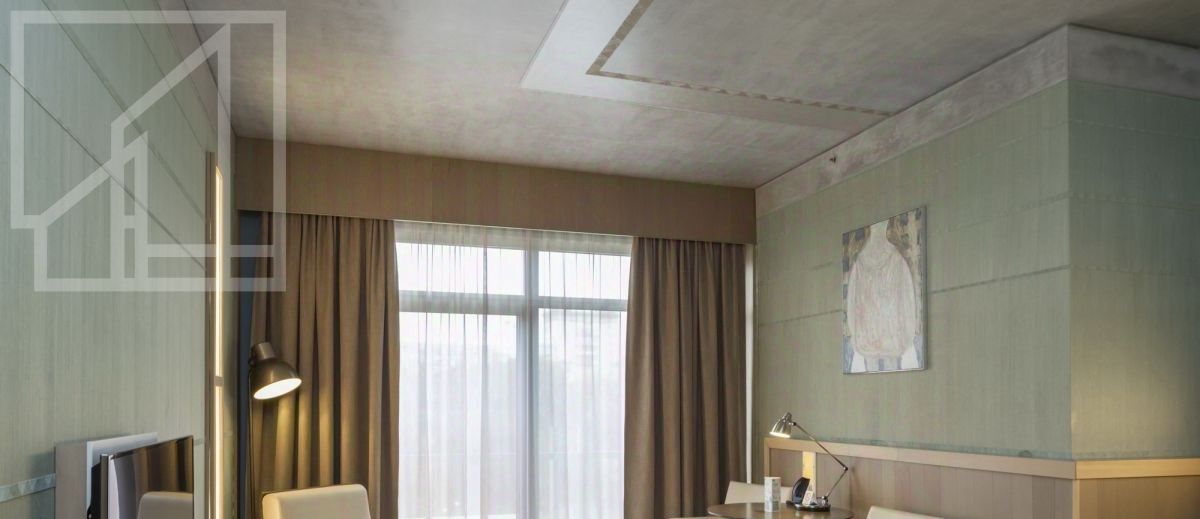 Планировка: спальня с зоной отдыха, кухня с обеденной зоной, раздельный с/у с ванной. Апартаменты меблированы, укомплектованы всей необходимой для жизни бытовой техникой. Панорамные окна, своя прачечная, заказ из ресторана прямо в номер.