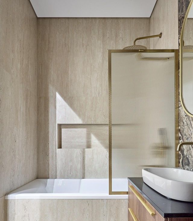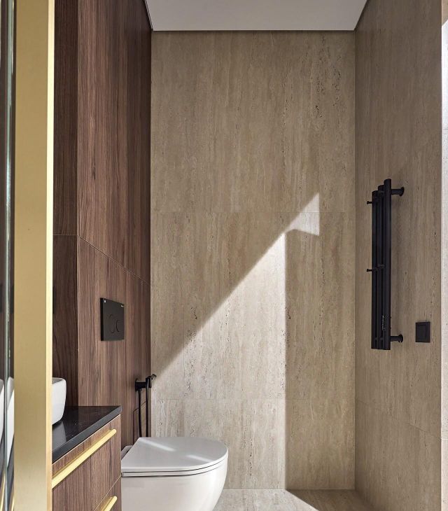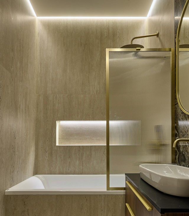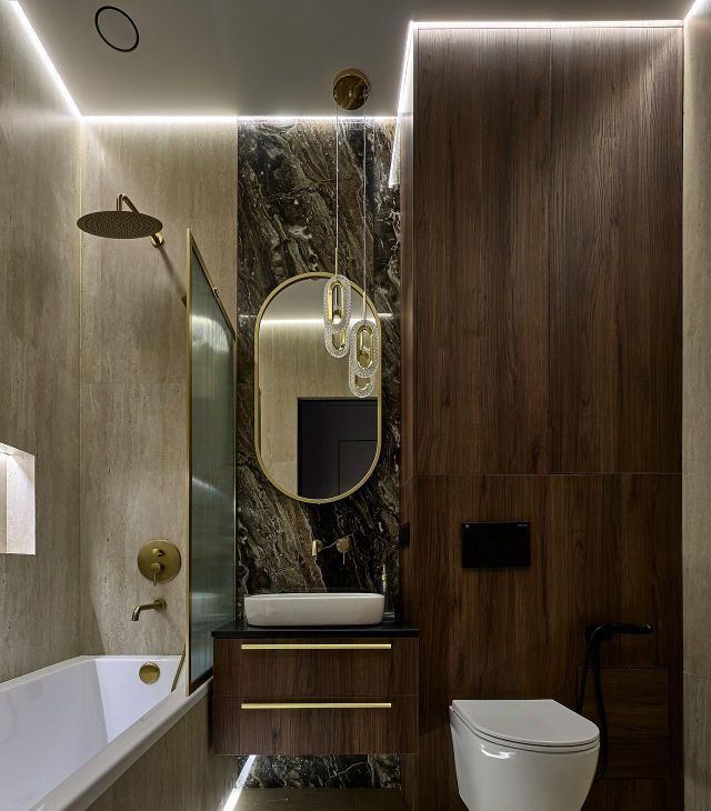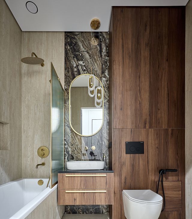 Просторная ванная комната, качественная сантехника, встроенная душевая система, подсветка, много места для хранения.