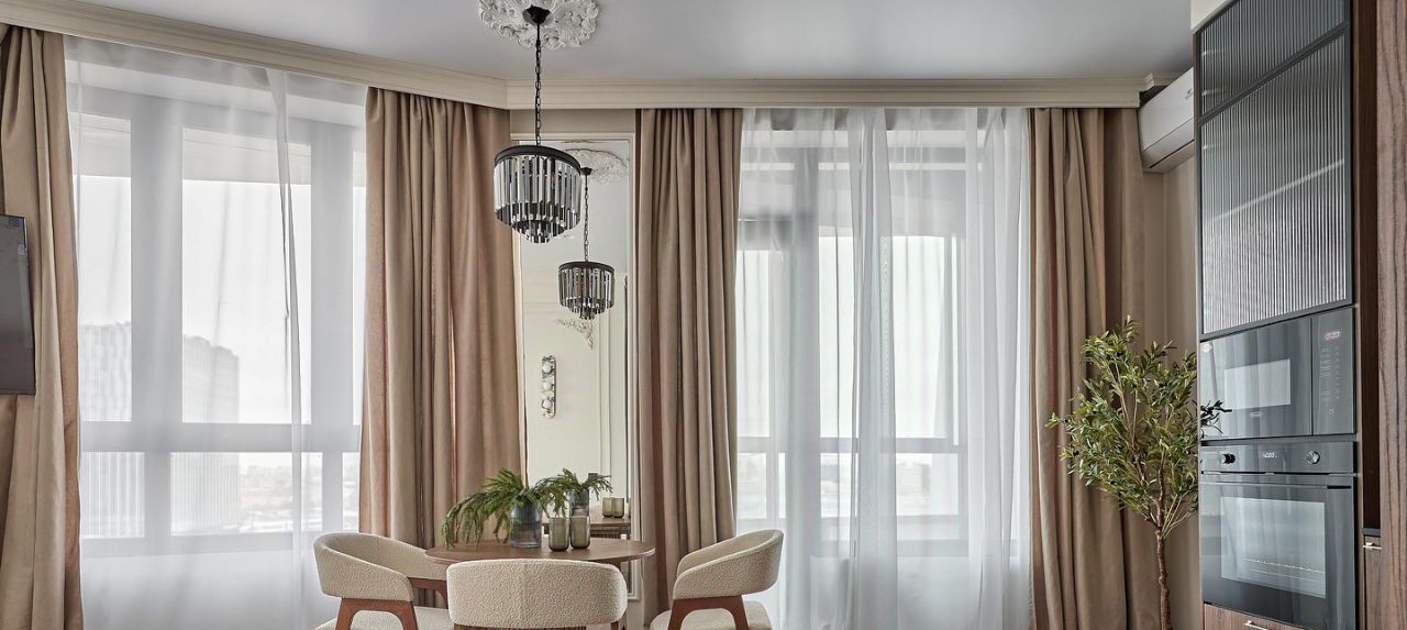 Кухня-гостиная с тремя панорамными окнами и балконом, большой раскладной диван, обеденный стол и стулья из натурального дерева, кухня на заказ, столешница из искусственного камня, смеситель, мойка и диспенсер -omoikiri,фильтр для питьевой воды, вся техника delonghi,измельчитель bon crusher,доводчики.