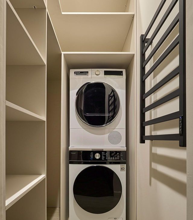 Отдельная постирочная комната, стиральная и сушильная машины, множество места для хранения.