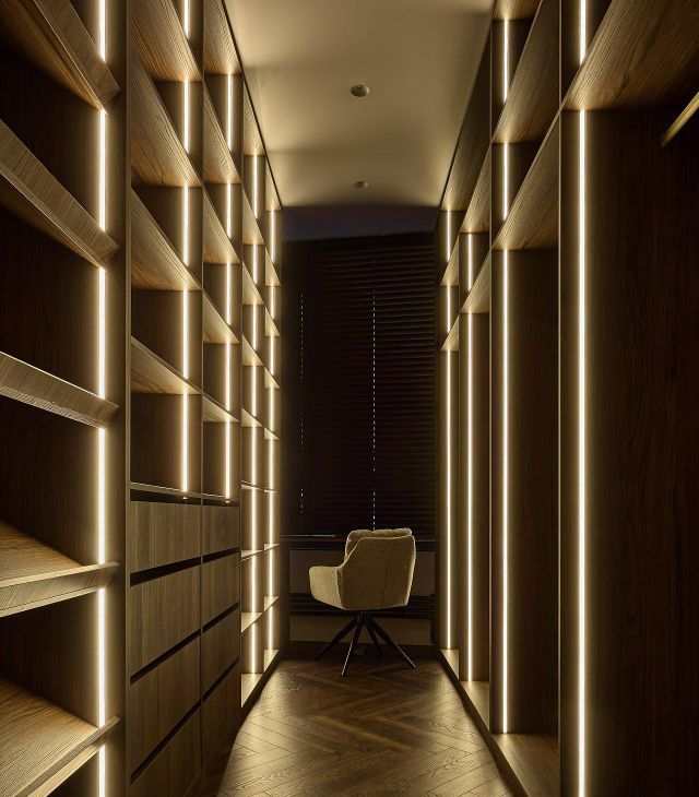 Огромная гардеробная с полноценным рабочим местом у окна.