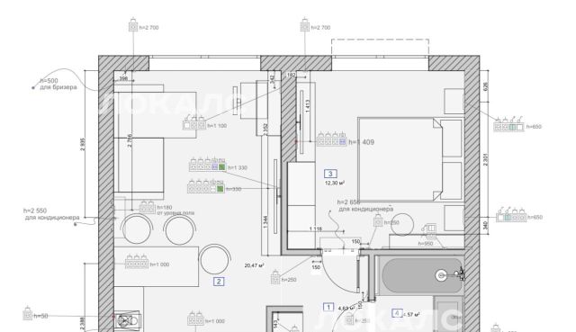 * Кухня-гостиная: встроенная мебель, холодильник, посудомоечная машина, индукционная плита, духовой шкаф, микроволновка, вытяжка, угловой диван, ковер, рабочий стол, большой смарт-ТВ, бризер, кондиционер, теплый пол, зонированное освещение.