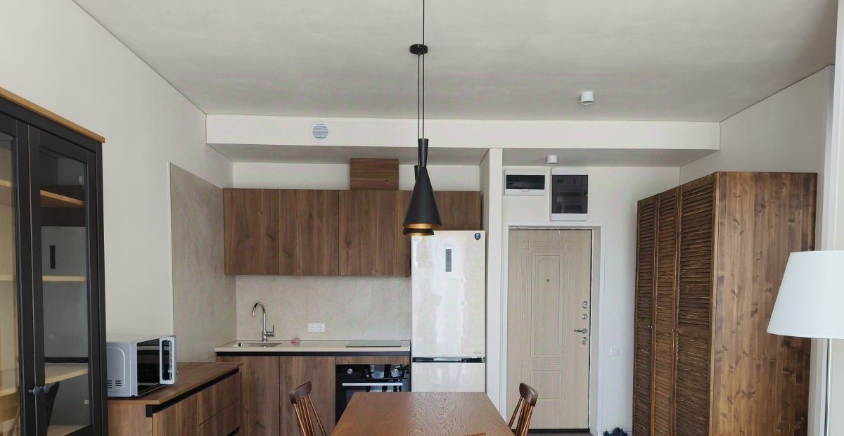 Стильная кухнягостиная с обеденной зоной; светлые комнаты с большими окнами; отдельная спальня с удобной кроватью; современная ванная комната, продуманное хранение (шкафы, гардеробная).