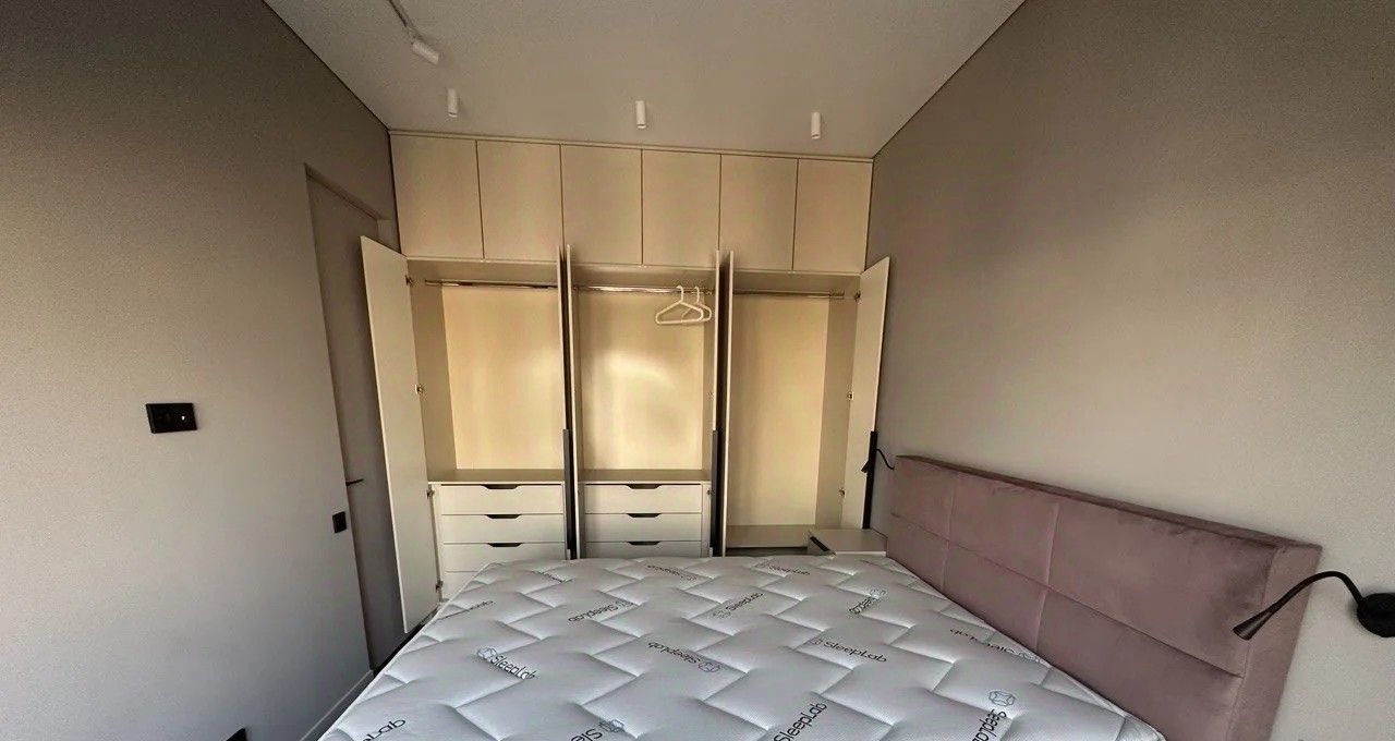 Квартира светлая и уютная, с просторной кухней-гостиной. В комнате двуспальная кровать и большой вместительный шкаф. С/у с душевой кабиной. В прихожей - встроенный шкаф и обувница. Также, есть гардеробная.