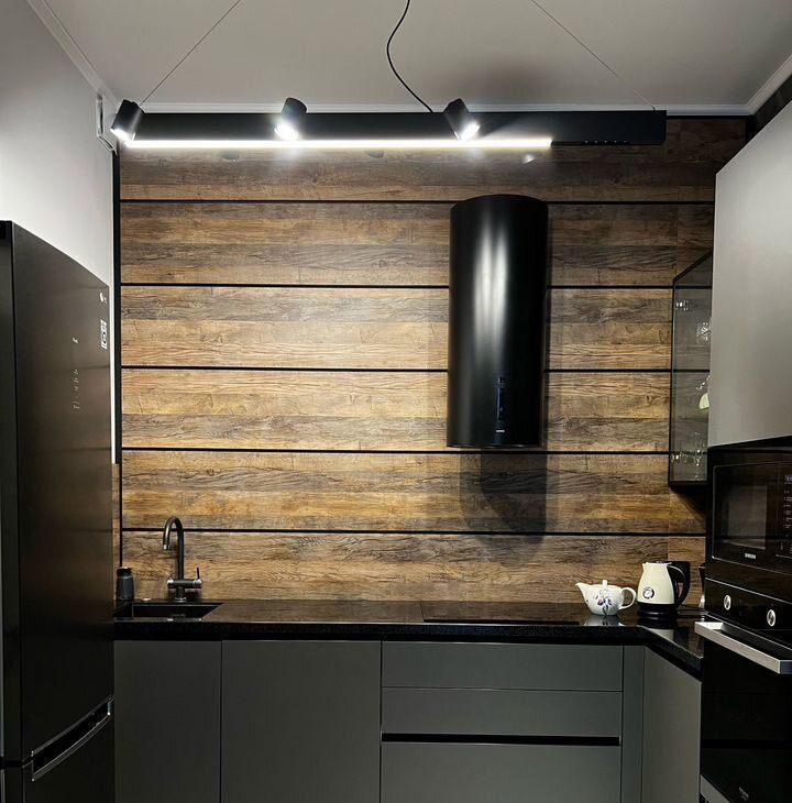 Кухня-гостиная оснащена современной мебелью и техникой.