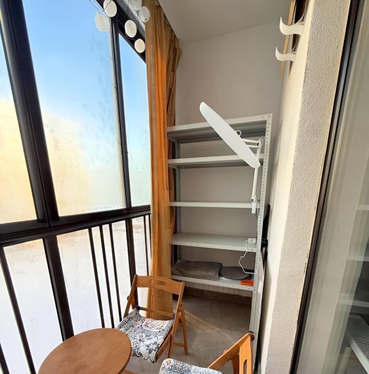 Есть панорамный балкон со стеллажом, в летний период можно разместить столик, стулья и встречать рассвет.