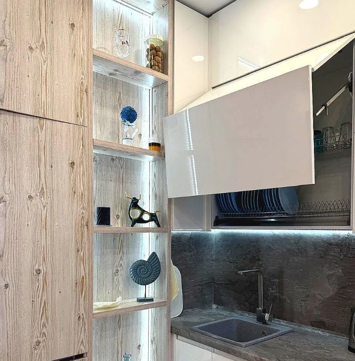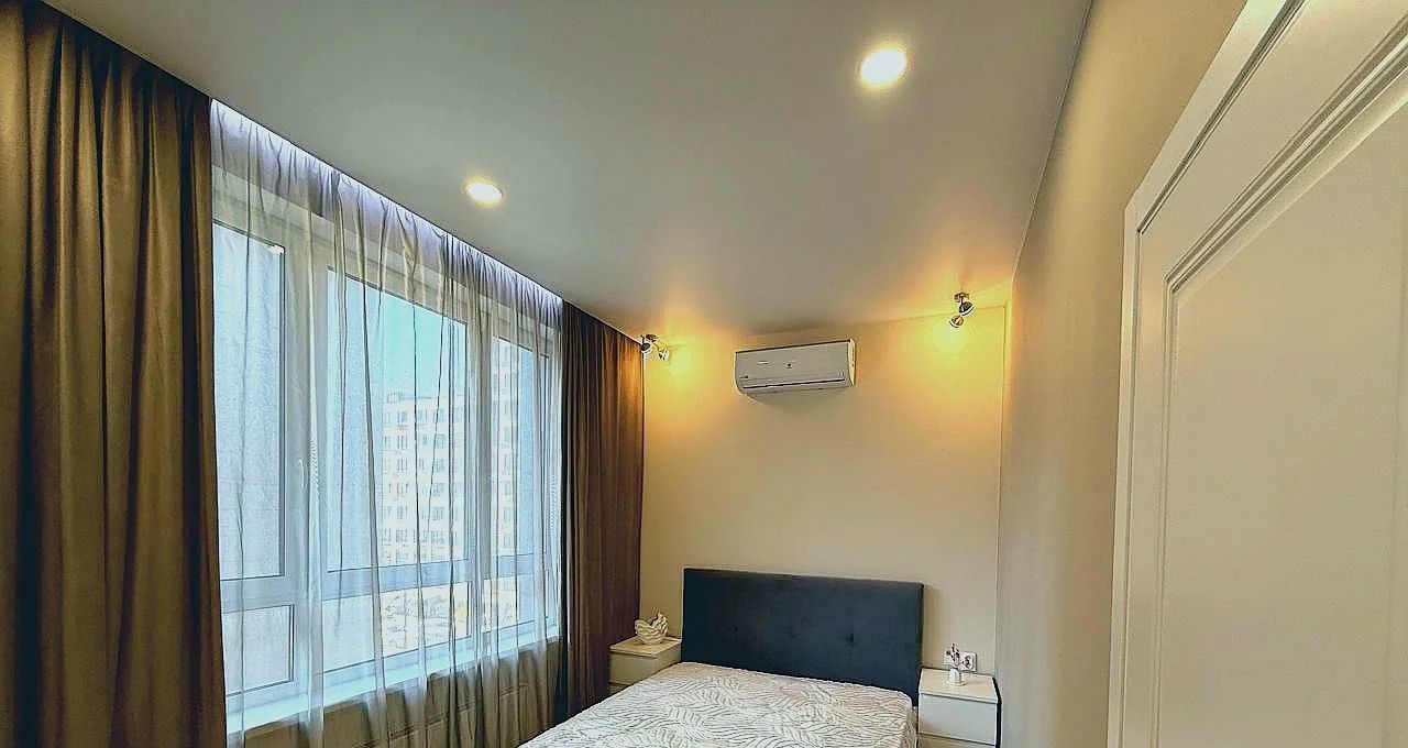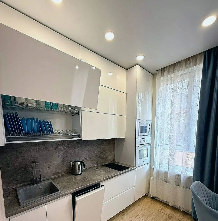 - Просторная кухня оборудована всей необходимой мебелью и техникой: холодильник, посудомоечная машина, кондиционер.