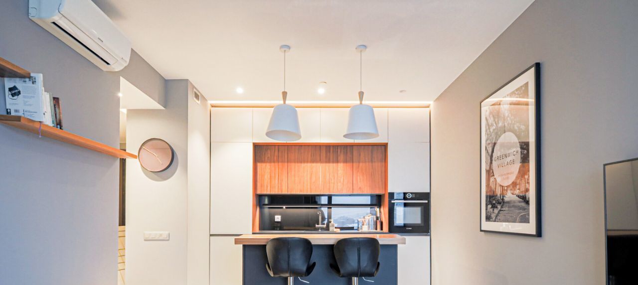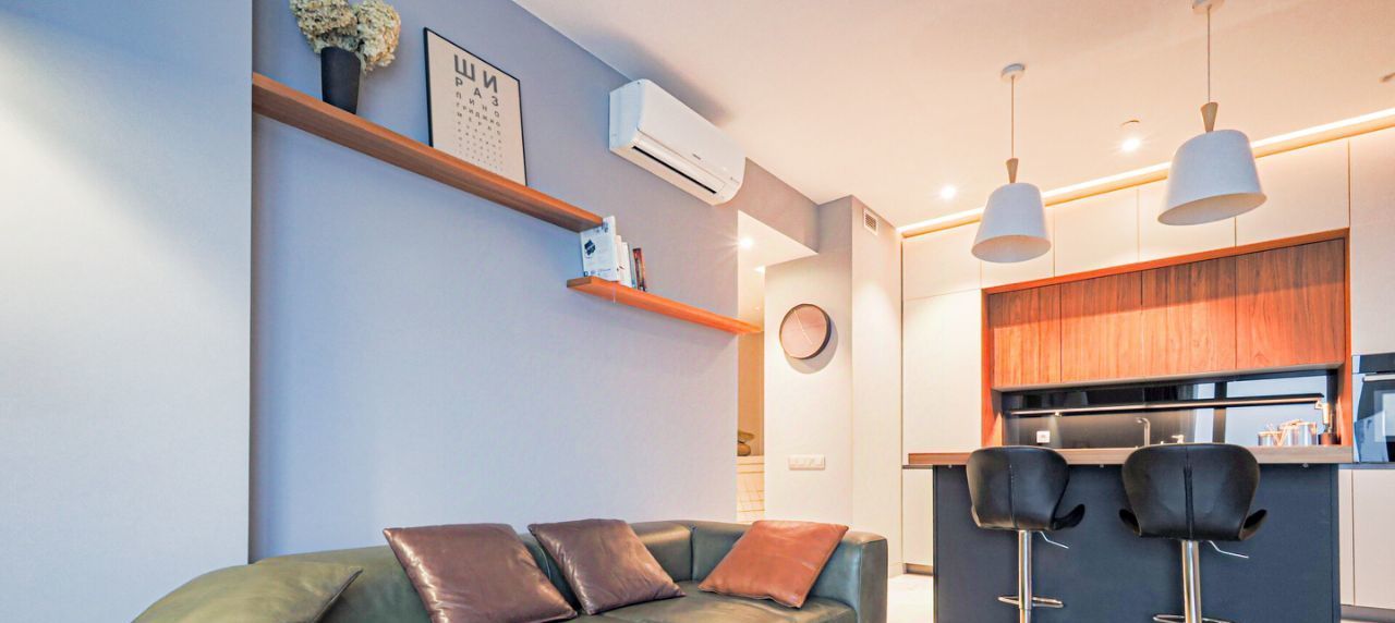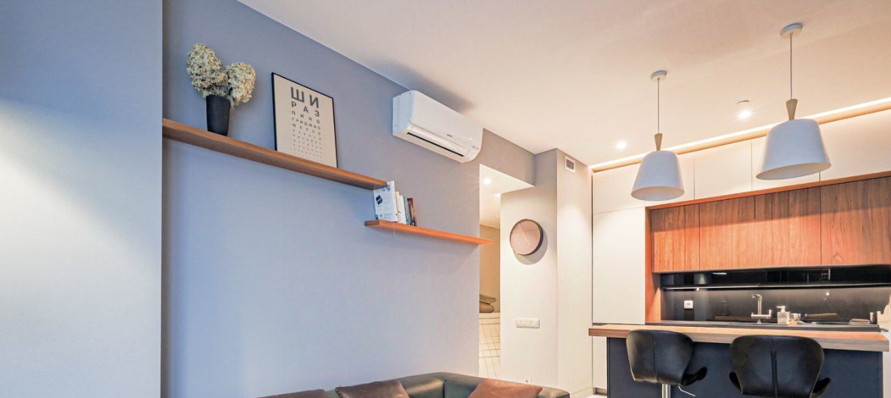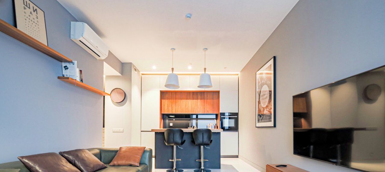 В квартире выполнен дизайнерский ремонт, приточно-вытяжная вентиляция+два кондиционера. Встроенная кухня с посудомоечной машиной, холодильник, стиральная машина. В гостиной стоит большой диван, в спальне двуспальная кровать. По мебели и бытовой технике есть всё необходимое для комфортного проживания.