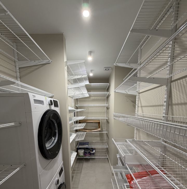 В квартире много систем хранения (отдельная кладовая-постирочная, шкаф-портал в спальне и коридоре).