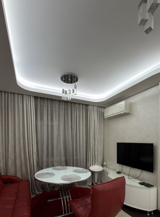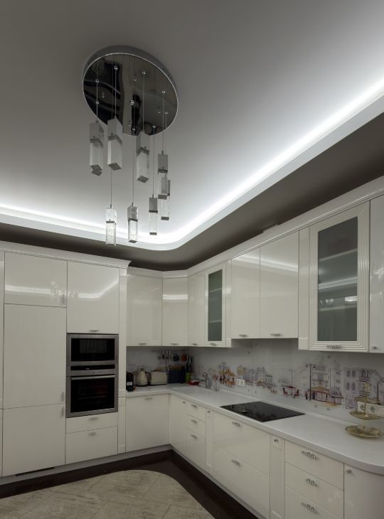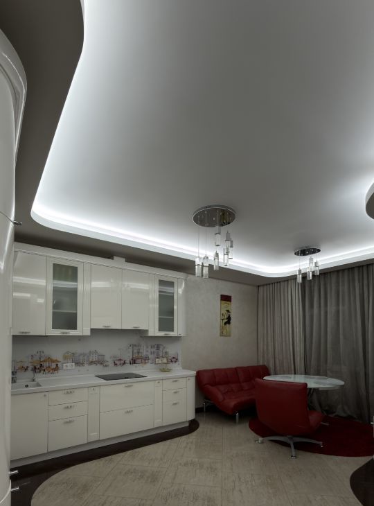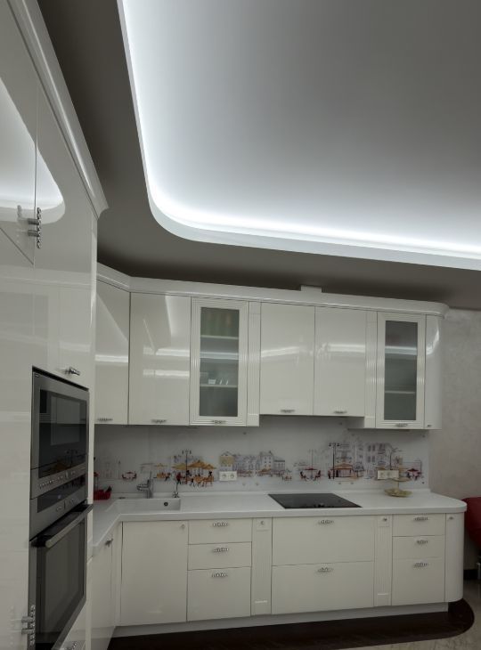 Кухня-гостиная: гарнитура, встроенная техника Neff (холодильник, плита, вытяжка, посудомоечная машина, духовой шкаф, СВЧ,кофе машина) обеденная зона, кондиционер, телевизор.