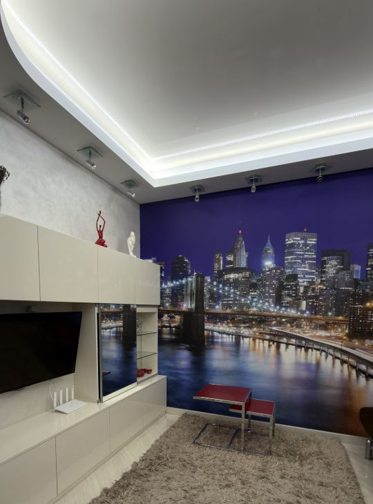 . Гостевая комната: диван, телевизор, место для хранения, журнальный столик.